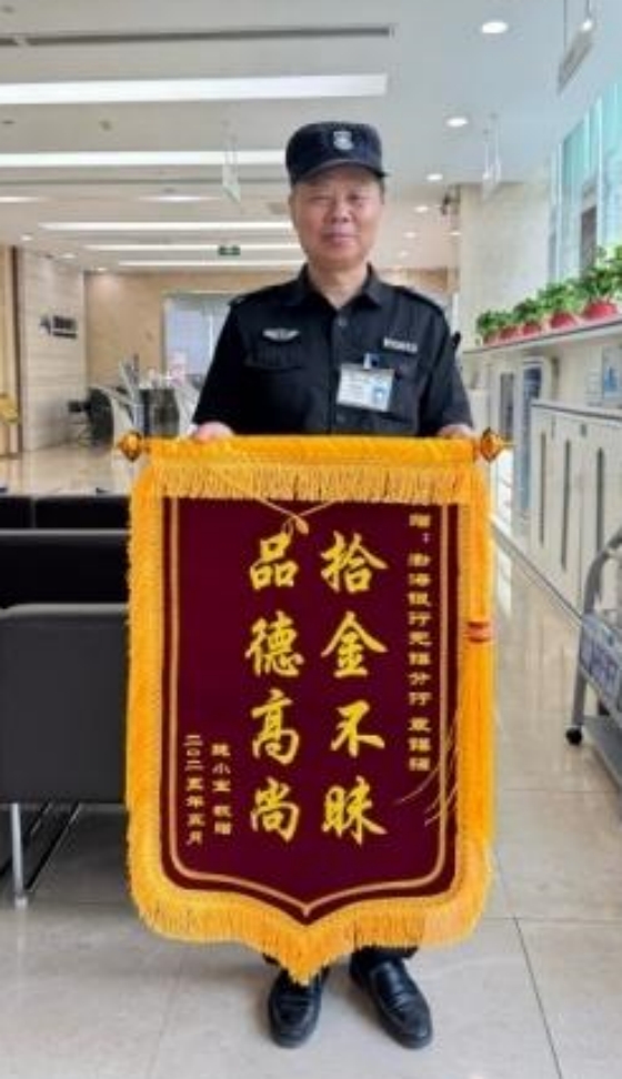 近日,公司派駐渤海銀行無錫分行營業(yè)部收到一面繡有“拾金不昧,品德高尚”的錦旗。贈送者魏先生緊緊握住保安隊員袁錫強的手,再三表達感謝。